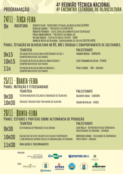 A programação, que conta com o apoio do Instituto Brasileiro de Olivicultura (IBRAOLIVA) e a participação do presidente do instituto, Paulo Marchioretto, prevê três painéis, onde especialistas do Brasil, Uruguai e Espanha apresentarão a situação da olivicultura nas principais regiões produtoras desses países. Também serão abordados ao longo do evento, o comportamento produtivo das principais cultivares, aspectos nutricionais e fitossanitários e a alternância de produção.